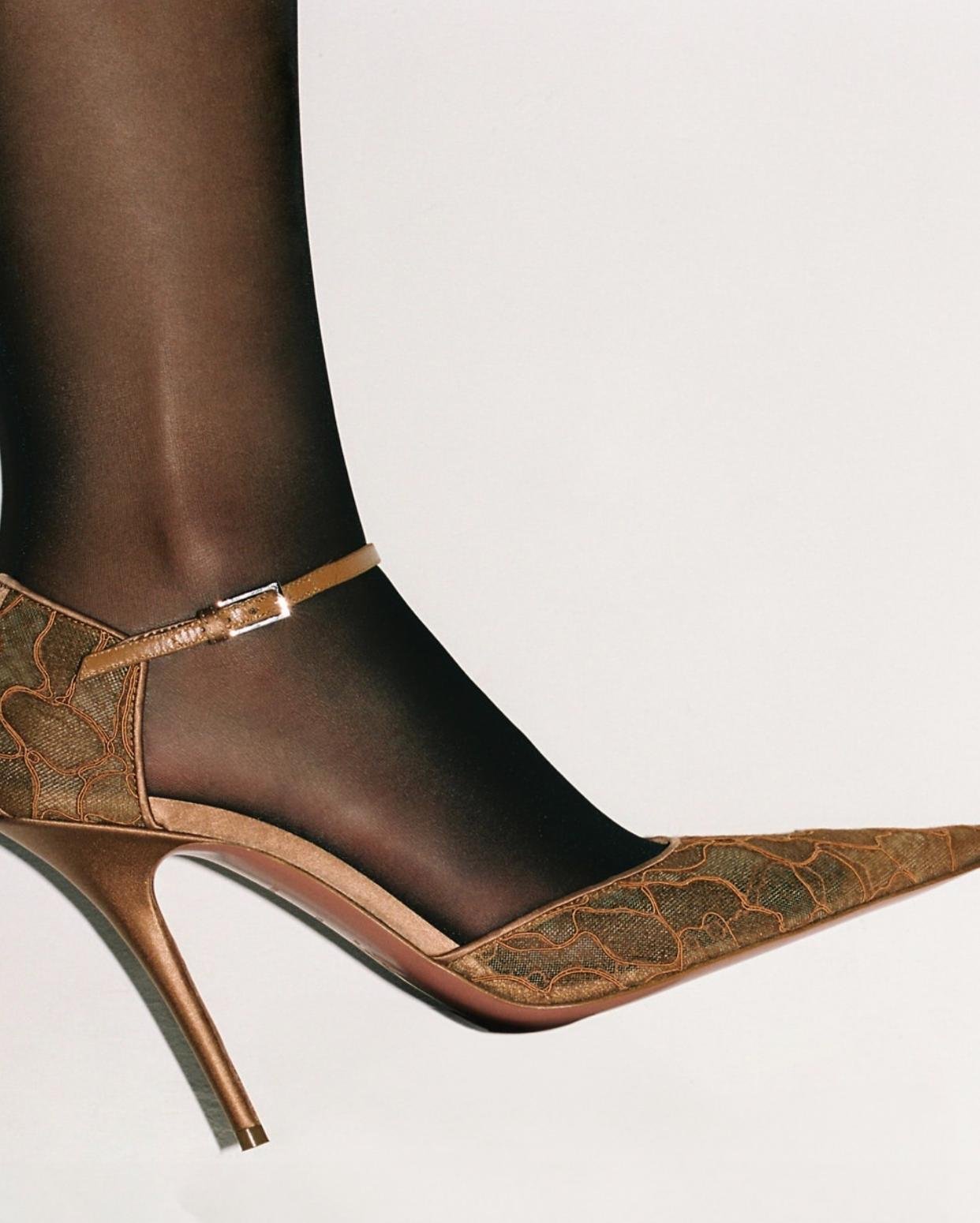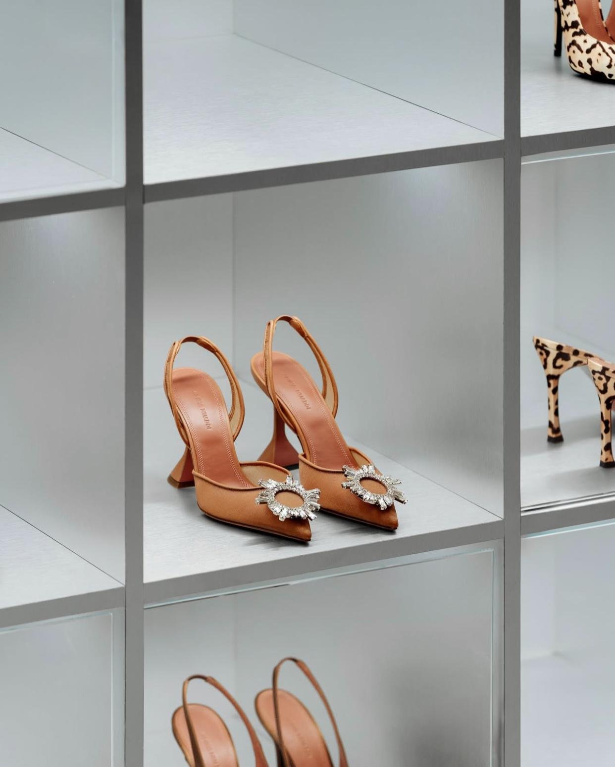 Fidèle à une vision de luxe conscient, Amina Muaddi développe sa maroquinerie et sa ligne chaussures autour de :